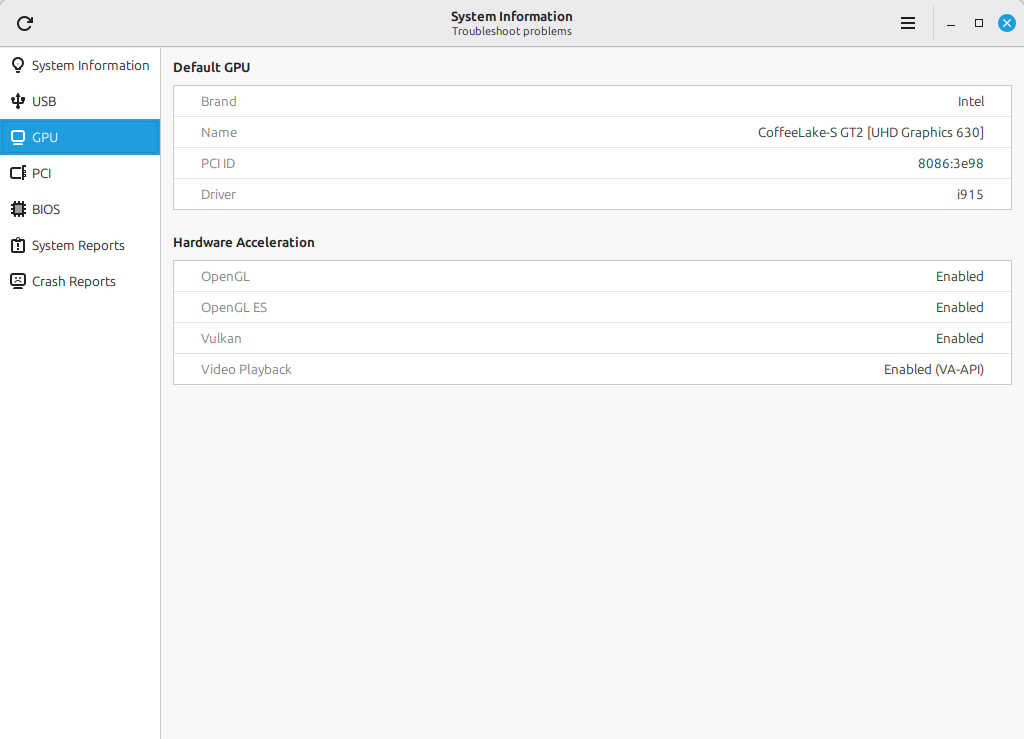 The “PCI” page gives you a detailed look at the internal components of the computer. The PCI ID and the driver in use are very useful when troubleshooting PCI devices.